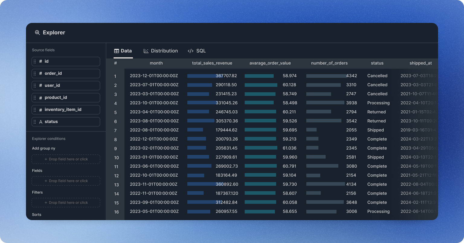 Explorer allows you to perform common data transformations via a graphical user interface while viewing the data. Explorer can be used on the execution results of the SQL Block or Charts in notebook and report.