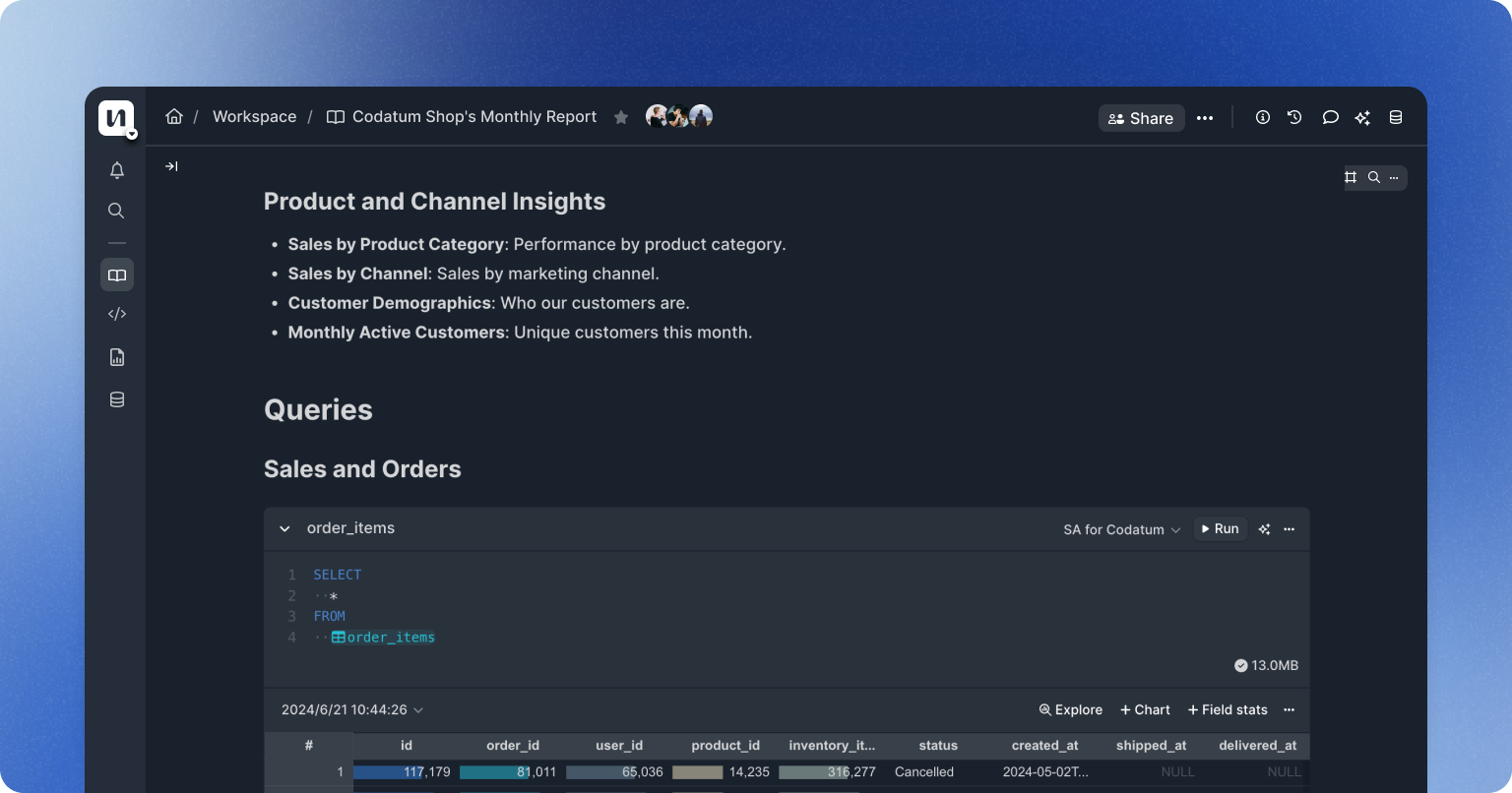 Doc Page is a page in notebook where you can extract, explore, and visualize data analysis. It allows for quick ad-hoc analysis and keeps a record of your process. The entire workflow can be managed smoothly using a keyboard-first user interface.